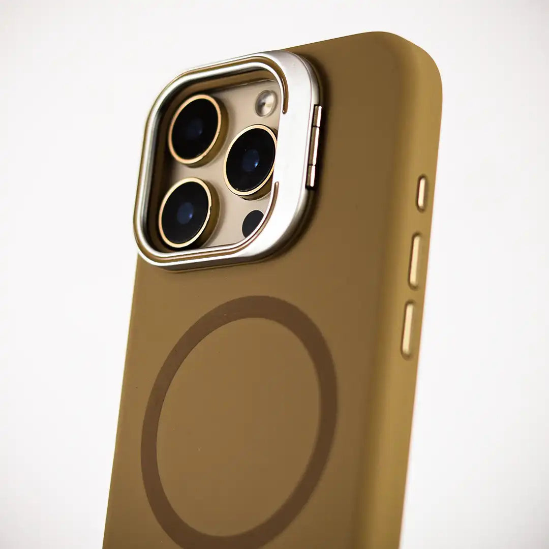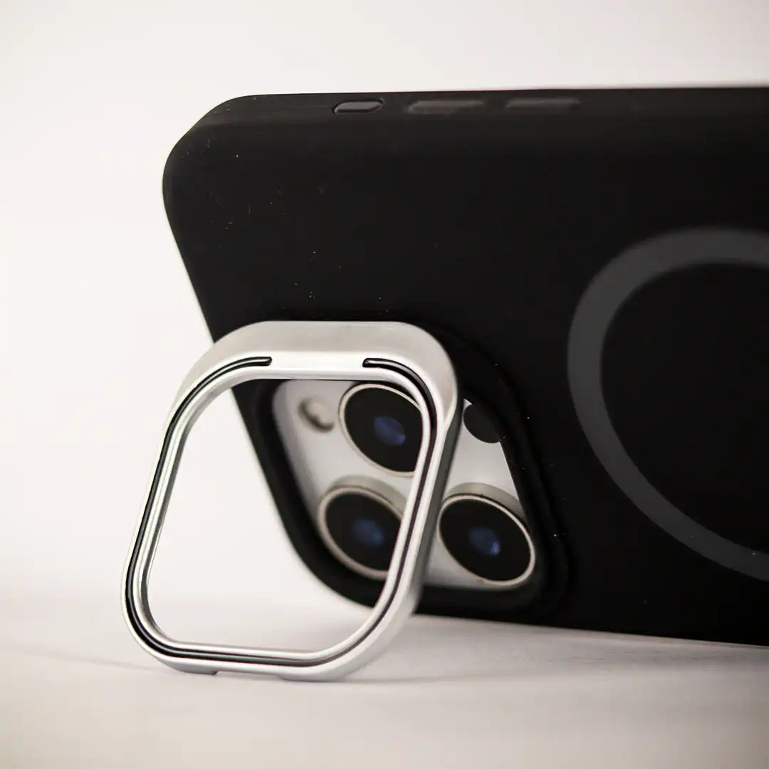 Designed with a square-shaped, foldable metal camera stand that protects your lens when not in use. The solid metal frame covers the camera area completely to help prevent scratches and damage. When opened, it doubles as a stable kickstand for hands-free viewing.