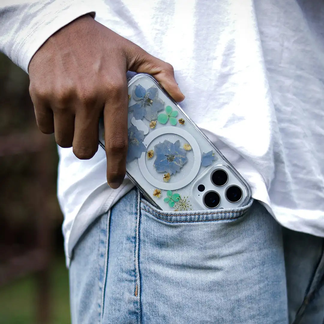 The Mag Flowers Series is crafted using real dried flowers, carefully hand-placed to create a truly one-of-a-kind design. Enhanced with subtle 3D foil accents, the floral patterns shimmer gently in the light, adding a refined and elegant finish. Built with integrated MagSafe magnets, the case ensures seamless wireless charging and effortless attachment to MagSafe accessories — all while maintaining a slim, premium feel.